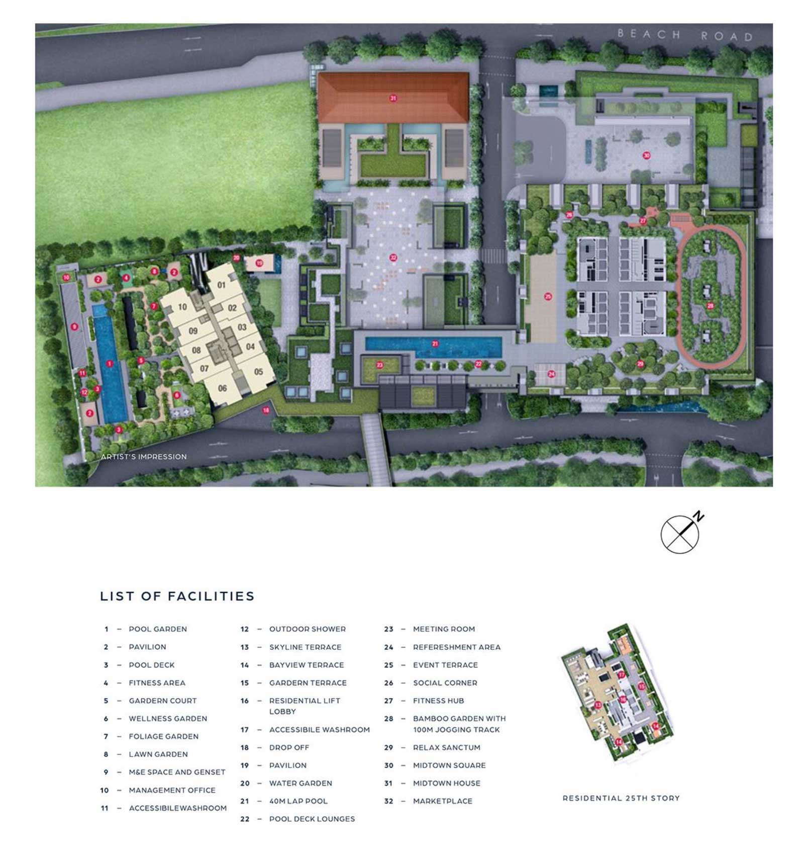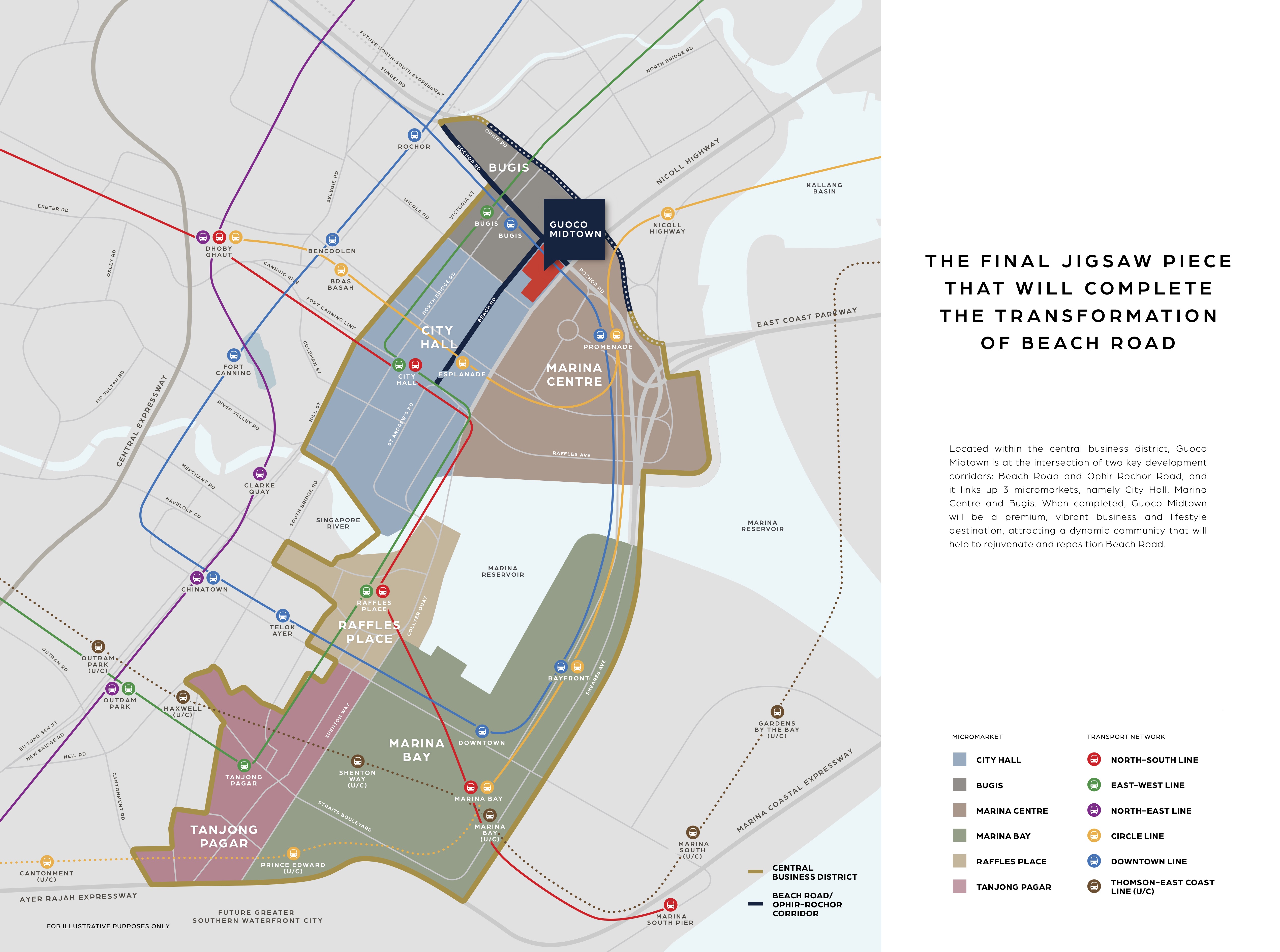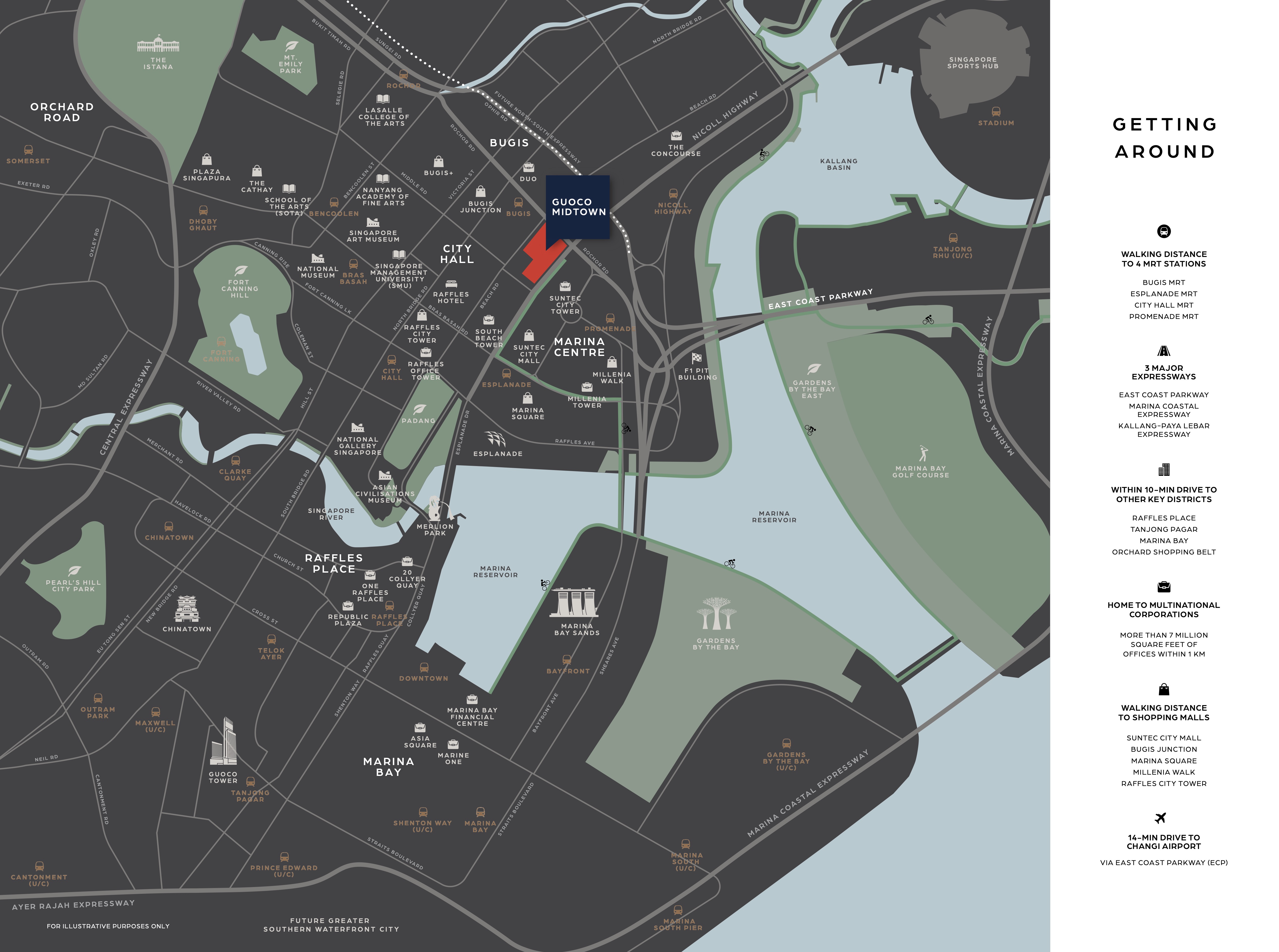 The mixed-use, integrated development will also be served by four MRT lines - the East-West, Downtown, North-South and Circle lines - and has a direct underground link to the Bugis MRT interchange station. For occupants who frequent in buses there are several bus stations located at Nilcoll Highway and Beach Road. The Central Expressway and East Coast Parkway are a few of the many major roadways connecting Guocoland Midtown Bays with Singapore City.